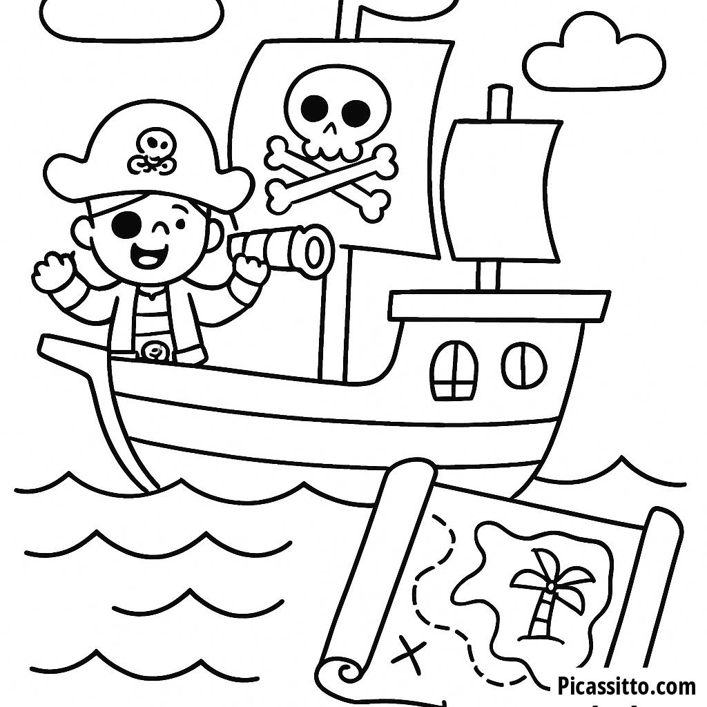 Setzen Sie die Segel zu einem bunten Abenteuer mit diesem kostenlosen Ausmalbild eines Piratenschiffs, das eine Schatzkarte zeigt! Perfekt für kleine Abenteurer, die bereit sind zu erkunden.