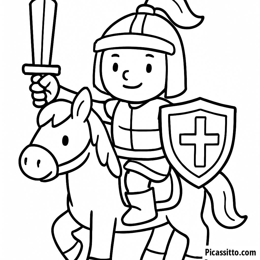 Laden Sie diese kostenlose und druckbare Ausmalseite herunter, die einen tapferen Ritter auf einem Pferd zeigt, der mit seinem Schwert und Schild bereit für das Abenteuer ist.