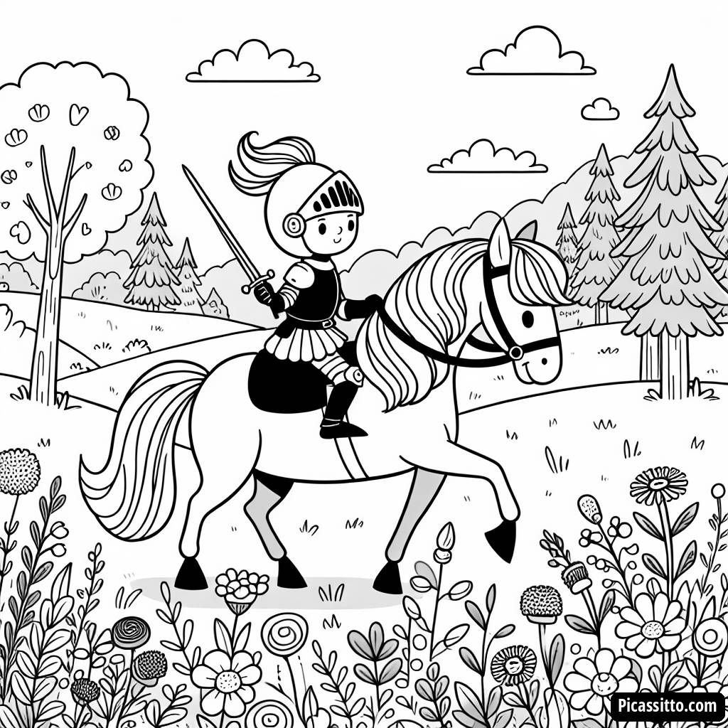 Laden Sie dieses kostenlose und druckbare Ausmalbild eines mutigen Ritters, der auf einem Pferd durch eine wunderschöne Wiese mit Wildblumen reitet, herunter. Ideal für junge Künstler, die Märchen lieben!