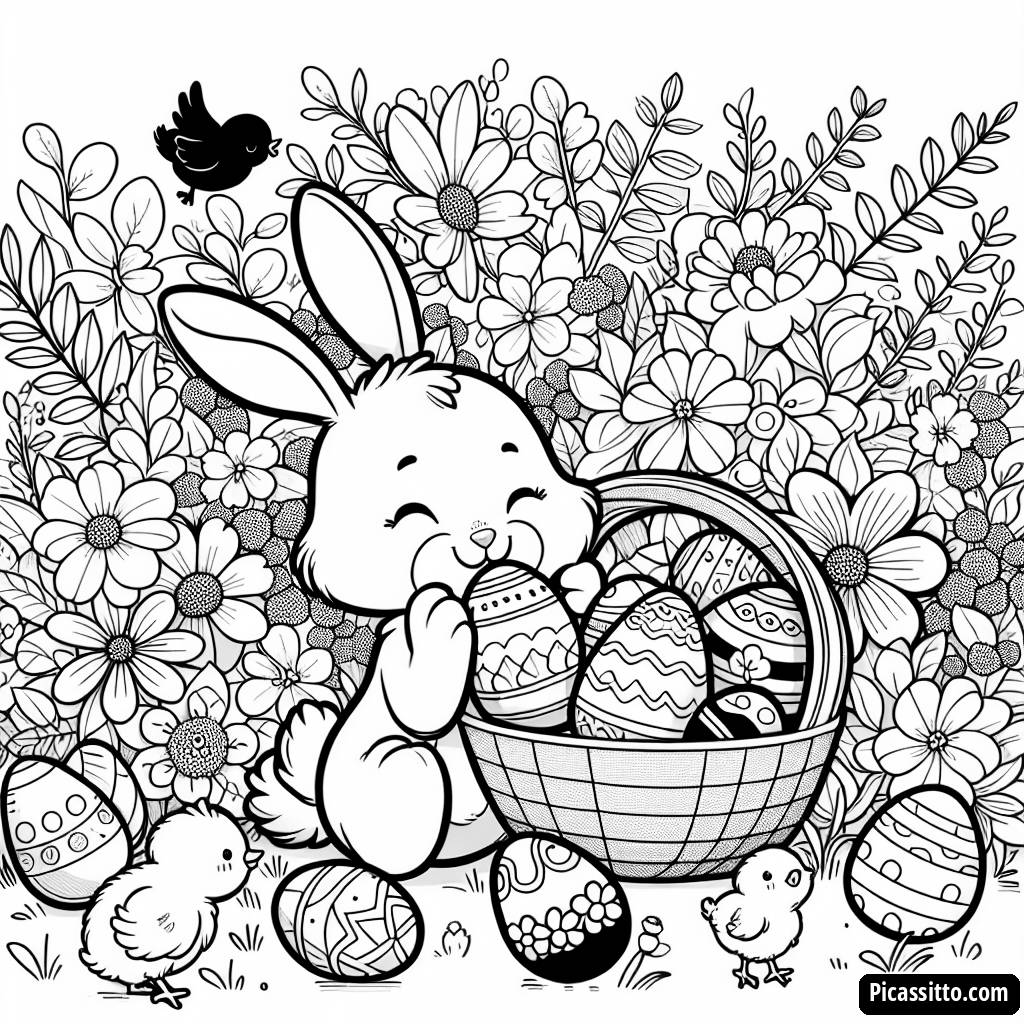 Lade diese kostenlose und druckbare Malvorlage mit einem fröhlichen Hasen herunter, der dekorierte Eier in einem bunten Garten mit blühenden Blumen und zwitschernden Küken versteckt!