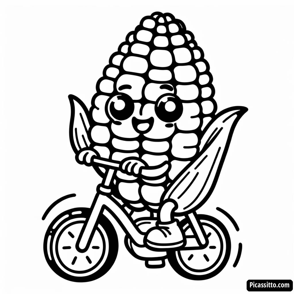 Lade diese kostenlose und druckbare Malvorlage mit einem fröhlichen Maiskolben, der Fahrrad fährt, herunter! Perfekt für Kinder, um Spaß zu haben und kreativ zu sein.