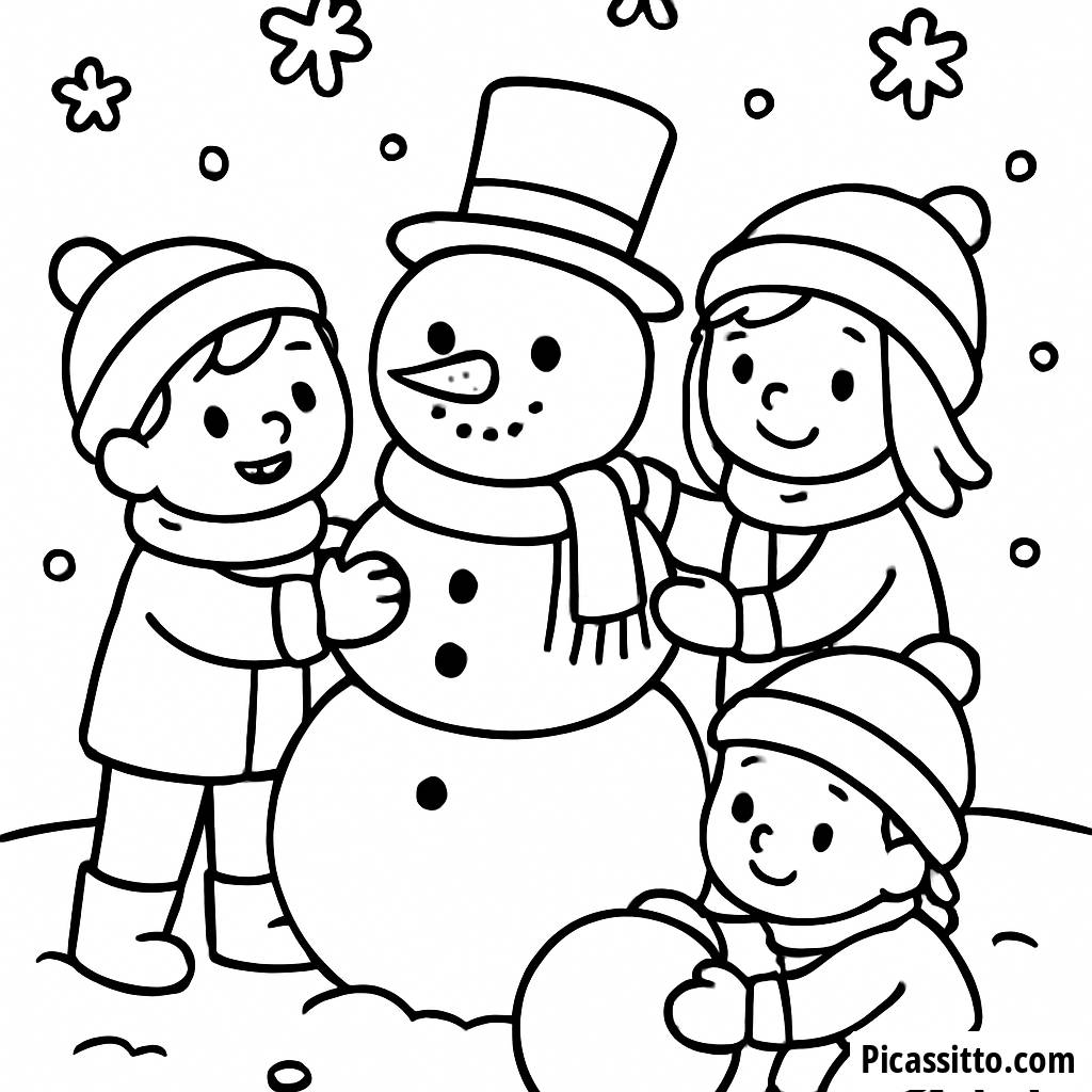 Genießen Sie diese kostenlose und druckbare Malvorlage einer gemütlichen Winterszene, in der Kinder einen Schneemann bauen und Schneeflocken vom Himmel fallen.