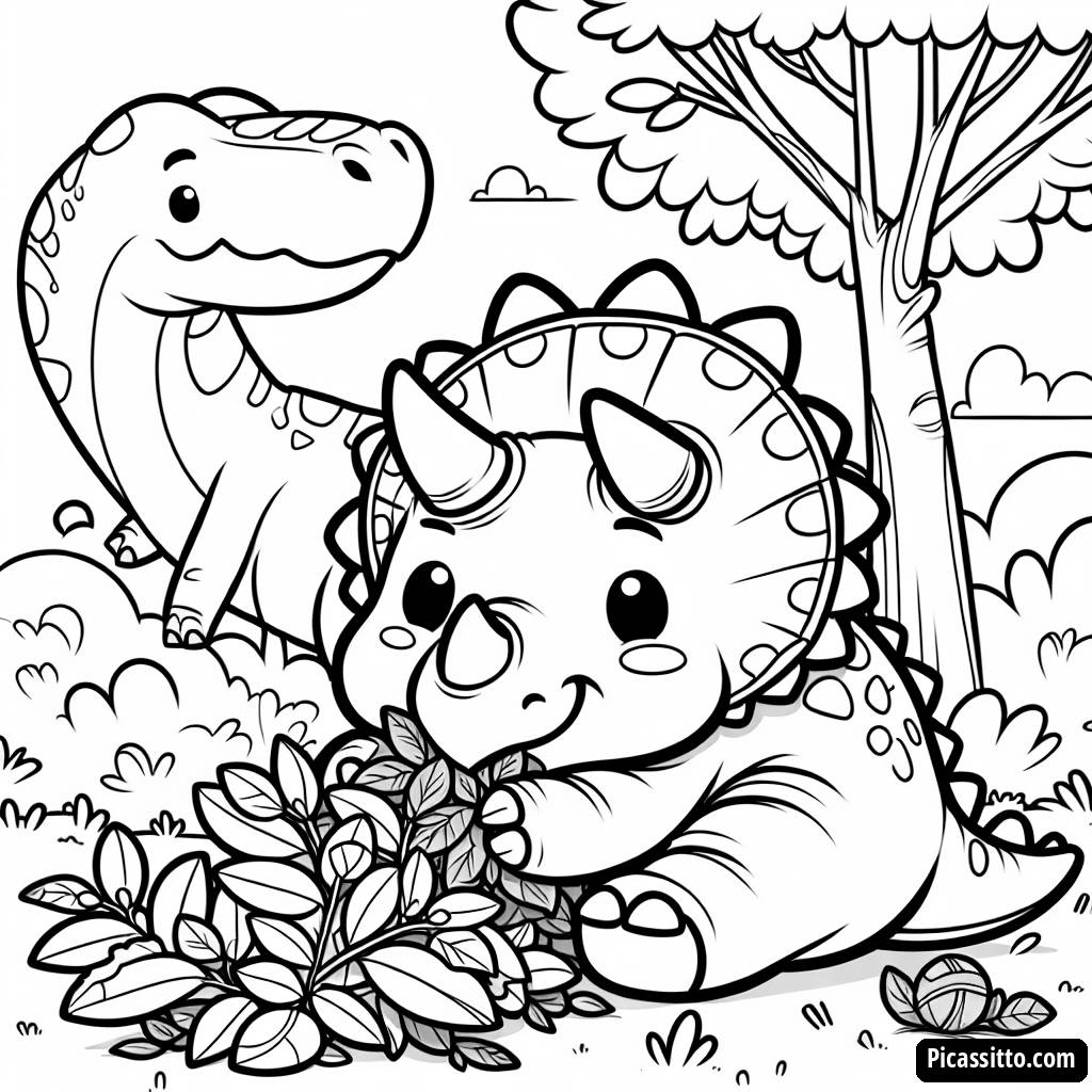 Lade dir diese kostenlose und druckbare Malvorlage herunter, die einen Triceratops zeigt, der Blätter frisst, während ein Brontosaurus hinter einem Baum hervorschaut. Perfekt für junge Dinosaurier-Fans!