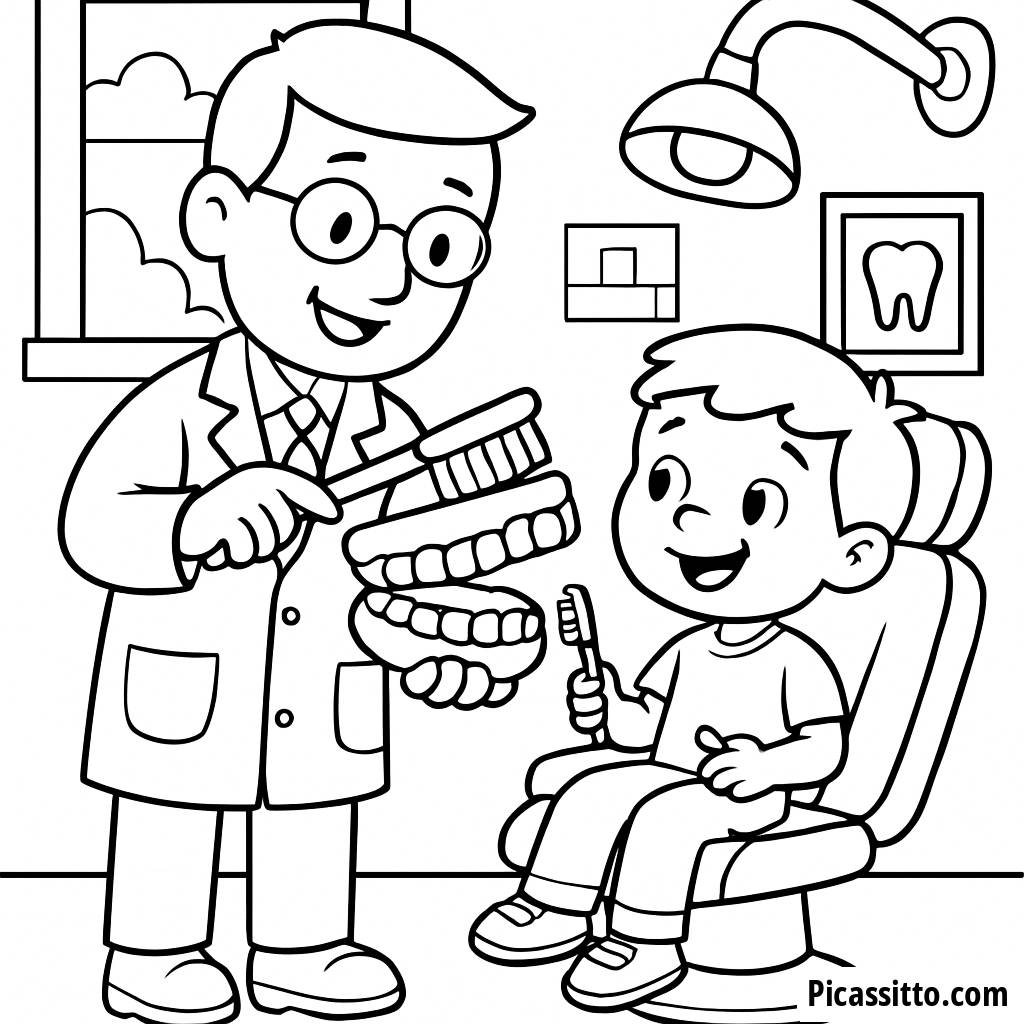 Laden Sie dieses kostenlose Ausmalbild vom Freundlichen Zahnarzt herunter und drucken Sie es aus, wo ein fröhlicher Zahnarzt einem Kind zeigt, wie man in einer bunten Zahnarztpraxis die Zähne putzt!