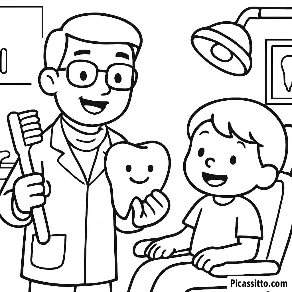 Diese kostenlose und druckbare Malvorlage zeigt einen freundlichen Zahnarzt, der einem Kind beibringt, wie man sich die Zähne putzt, in einer bunten Zahnarztpraxis. Ideal für Kinder, um spielerisch Zahnhygiene zu lernen!