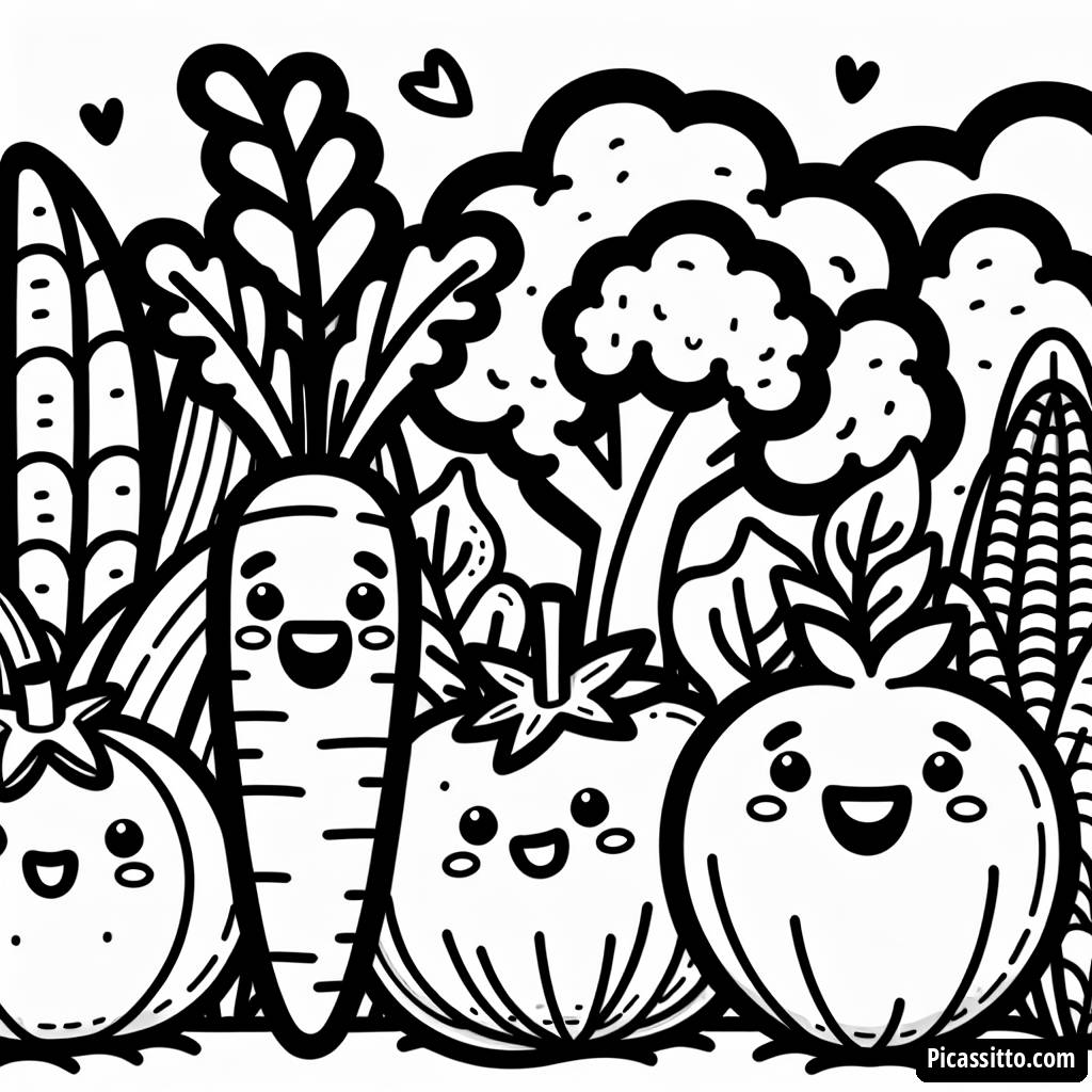 Genießen Sie dieses kostenlose Ausmalbild, das einen fröhlichen Gemüsegarten mit lächelnden Karotten, Brokkoli, Tomaten und Mais zeigt, die sich gegenseitig zuwinken!