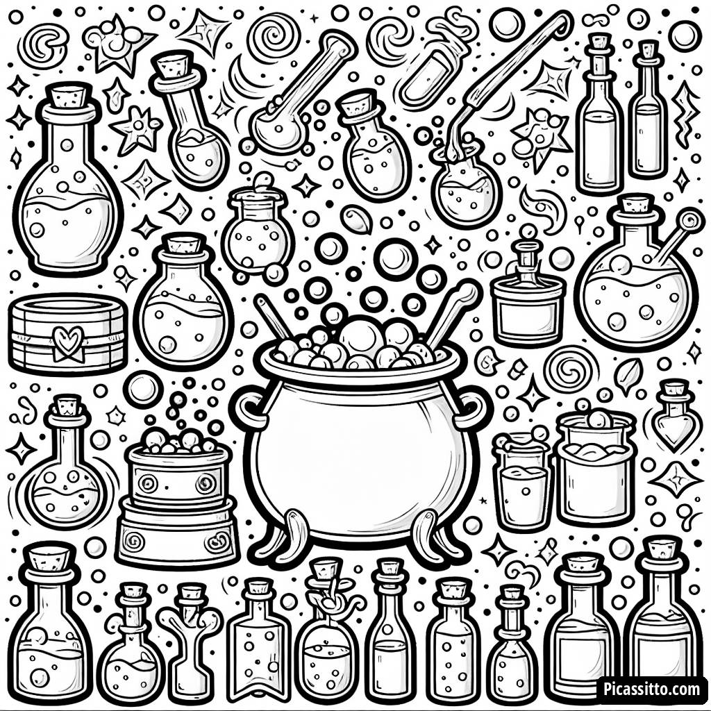 Tauche ein in eine magische Welt mit unserer kostenlosen und druckbaren Färbungsseite für Zaubertränke, voller sprudelnder Kessel und bunter Flaschen!