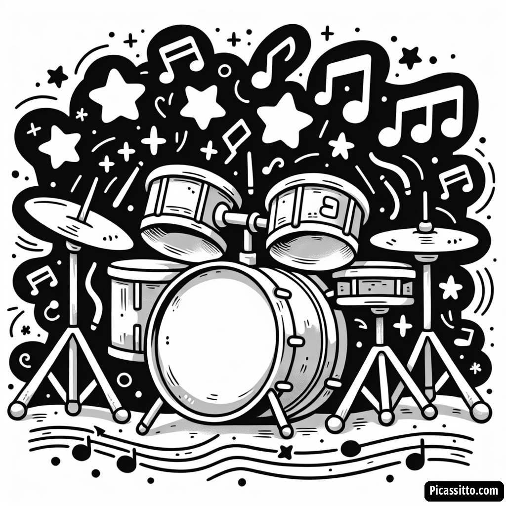 Bereiten Sie sich darauf vor, Ihre Kreativität mit diesem kostenlosen und druckbaren Ausmalbild vom Schlagzeug zu entfalten, das mit Musiknoten und tanzenden Sternen geschmückt ist!