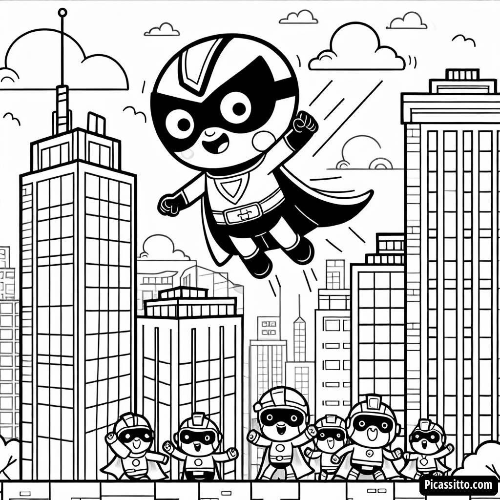 Lade diese kostenlose und druckbare Malvorlage von Spider-Man herunter, die den Helden zeigt, der zwischen den Gebäuden schwingt, während seine Spidey-Freunde ihn unten anfeuern. Perfekt für Kinder, die Superhelden lieben!