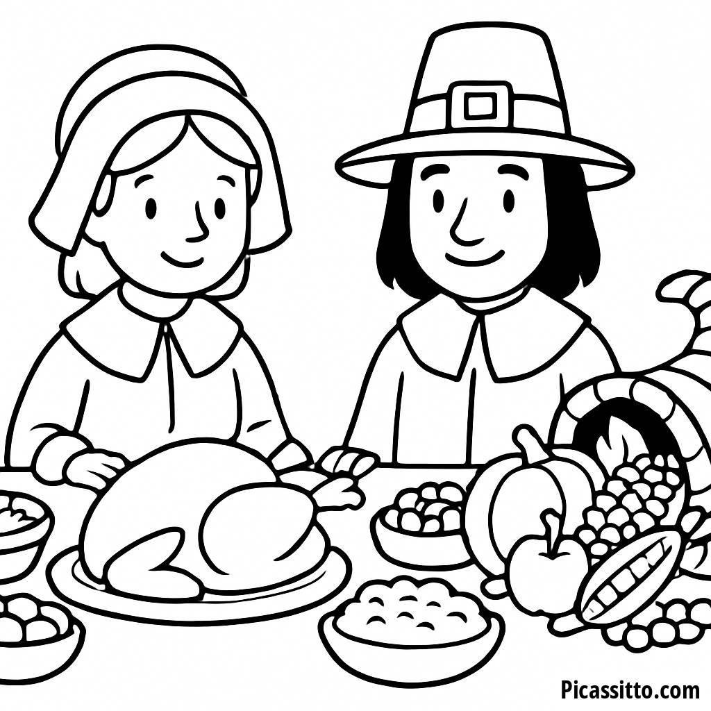 Genießen Sie diese kostenlose und druckbare Färbung Seite der Pilger zu Erntedank, die Pilger zeigt, die an einem festlichen Tisch mit köstlichem Essen und einer überquellenden Füllhorn sitzen. Perfekt für Kinder, um den Feiertagsgeist zu feiern!