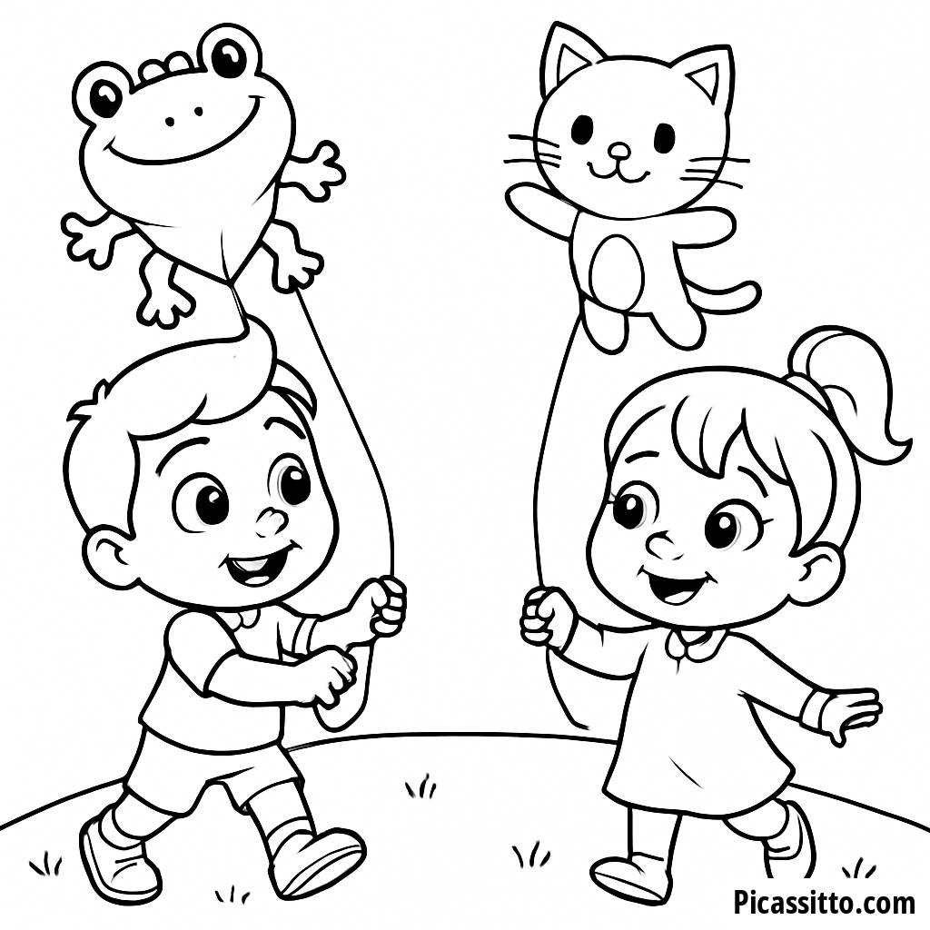 Genießen Sie dieses kostenlose und druckbare Ausmalbild mit TomTom und YoYo, die Tier-Drachen auf einem sonnigen Hügel fliegen lassen! Lassen Sie Ihrer Kreativität freien Lauf und verleihen Sie dieser fröhlichen Szene lebendige Farben.