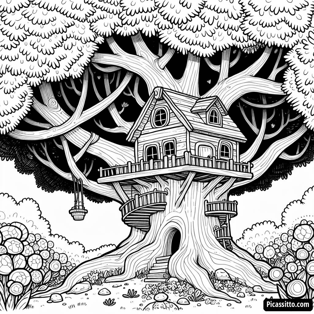Laden Sie diese kostenlose und druckbare Malvorlage eines verspielten Baumhauses herunter, ideal um die Kreativität von Kindern zu fördern.