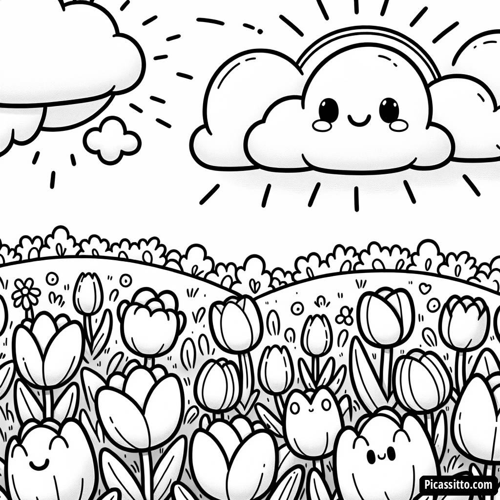 Genießen Sie dieses kostenlose und druckbare Ausmalbild eines verspielten Tulpenfeldes mit einer lächelnden Sonne und flauschigen Wolken! Perfekt für Kinder, die Blumen und Kreativität lieben.