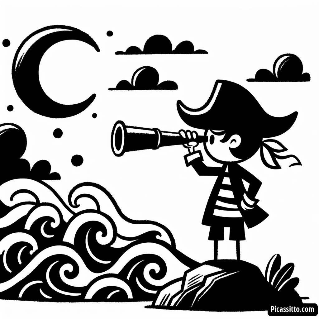 Download this free and printable coloring page featuring an adventurous pirate standing on a rock with a telescope. Perfect for little artists who love the high seas!