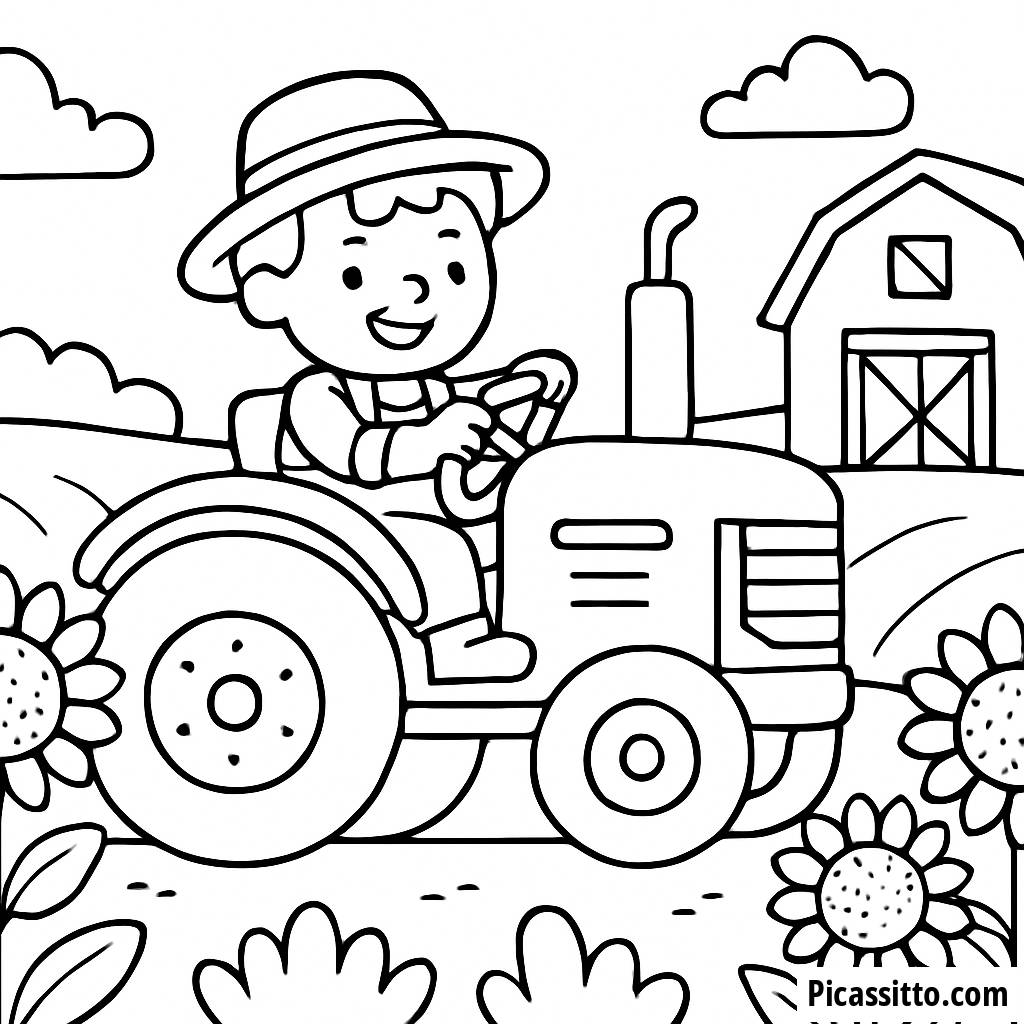 Download this free and printable cheerful farmer coloring page featuring a tractor and sunflowers. Perfect for young artists!