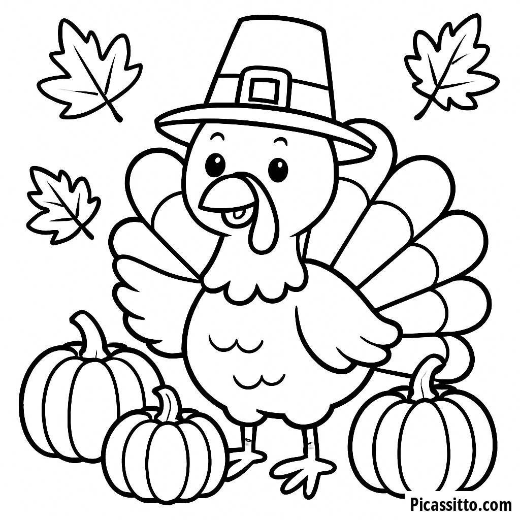 Get into the Thanksgiving spirit with this free and printable cheerful turkey coloring page, surrounded by pumpkins and autumn leaves. Perfect for kids to enjoy this festive season!