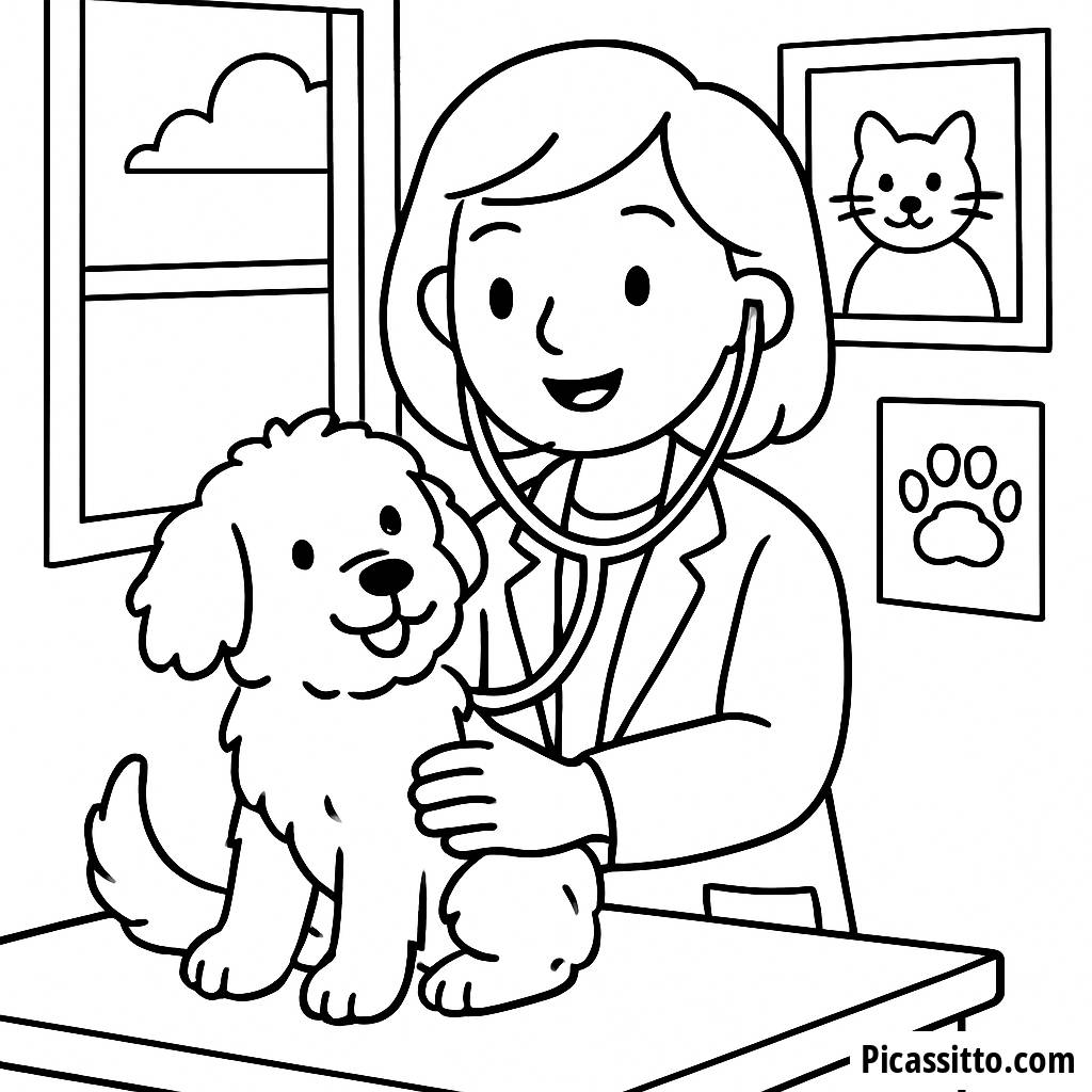 Download this free and printable coloring page of a cheerful veterinarian examining a fluffy puppy in a bright clinic. Perfect for little animal lovers!
