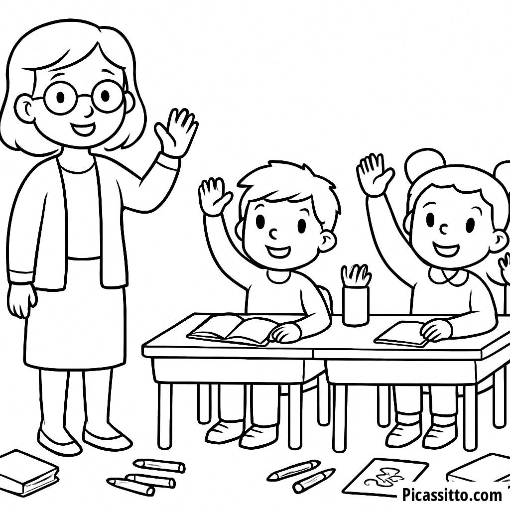 Download this free and printable Classroom Fun coloring page, featuring students at their desks raising their hands with books and art supplies around them! Let creativity flourish!