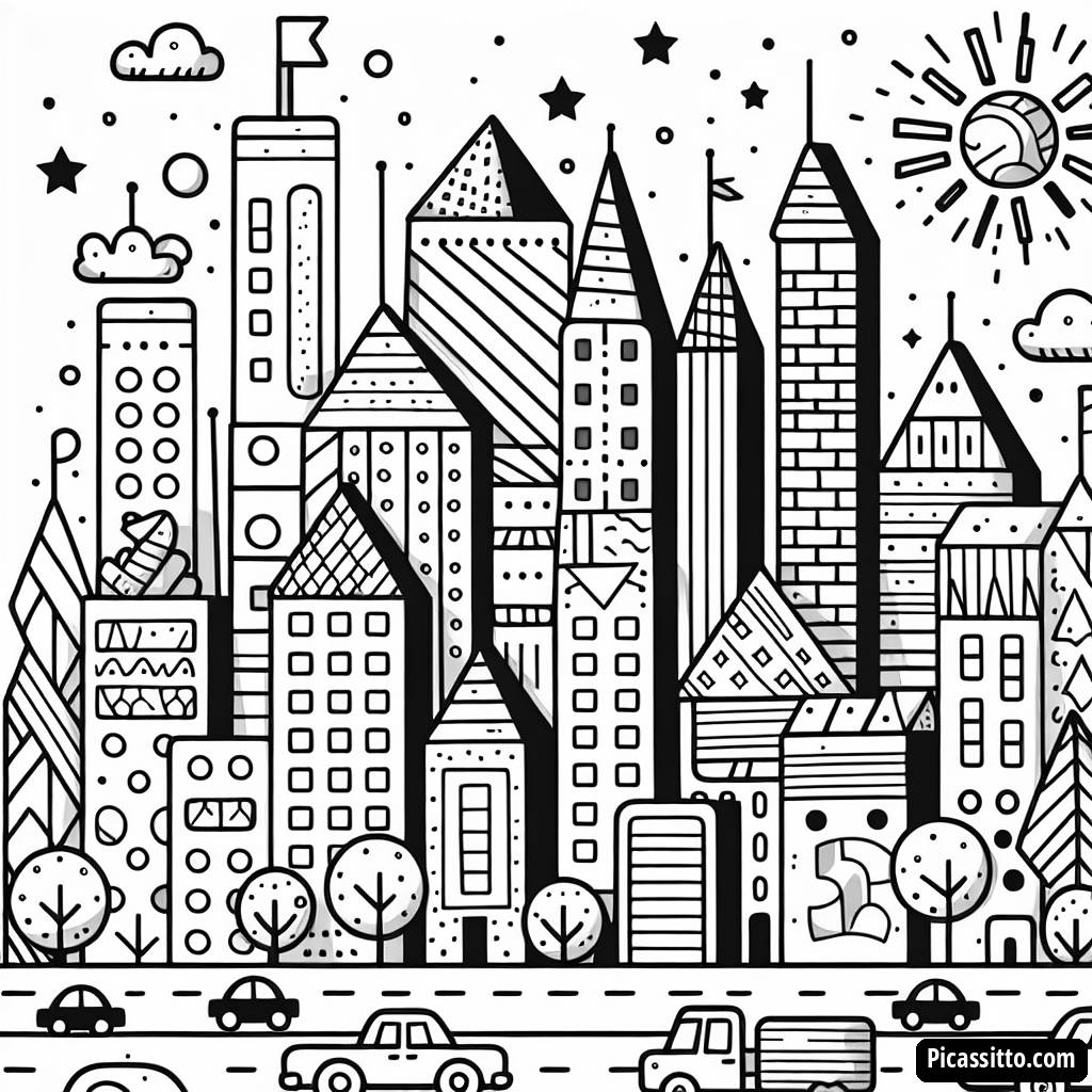 Explore the shapes of a busy cityscape with our free and printable coloring page featuring buildings made of triangles, rectangles, and circles under a starry sun!