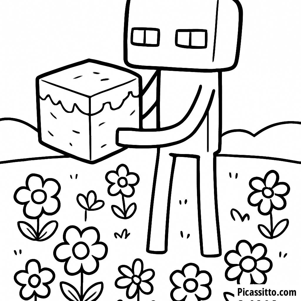 Enjoy this free and printable coloring page of an Enderman holding a block while standing in a vibrant flower field. Perfect for Minecraft fans!