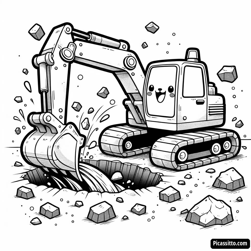 Download this free and printable coloring page featuring a cheerful excavator digging a big hole with dirt flying around. Perfect for little construction enthusiasts!