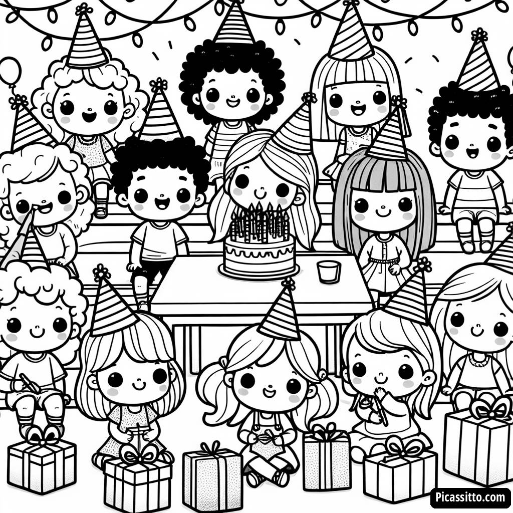 This free and printable birthday party coloring page features a group of children happily playing with presents at a festive table. Perfect for celebrating a special day with creativity!