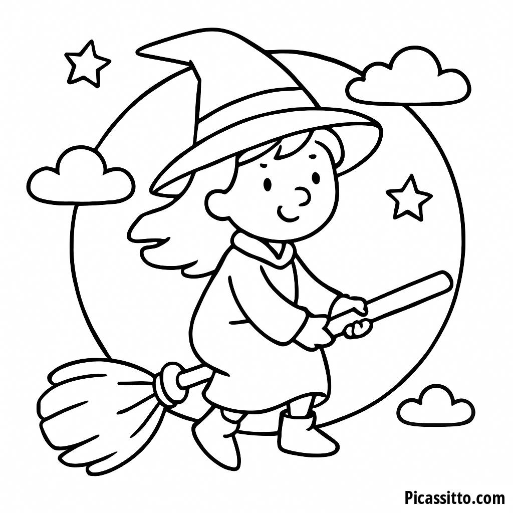 Download this free and printable coloring page featuring a friendly witch flying on her broomstick over a full moon—perfect for Halloween fun!