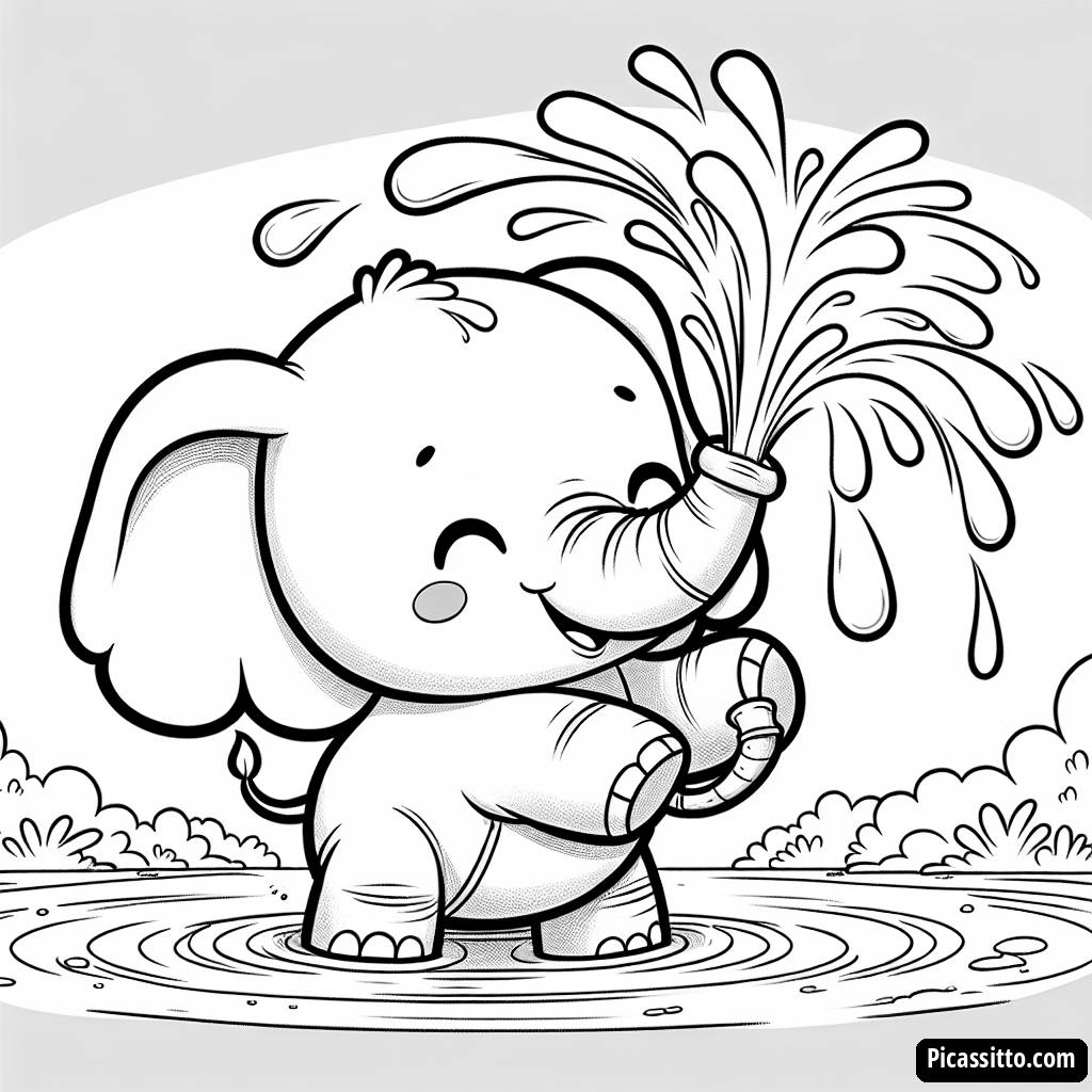 Enjoy this free and printable elephant coloring page, featuring a playful elephant spraying water with its trunk by a river!