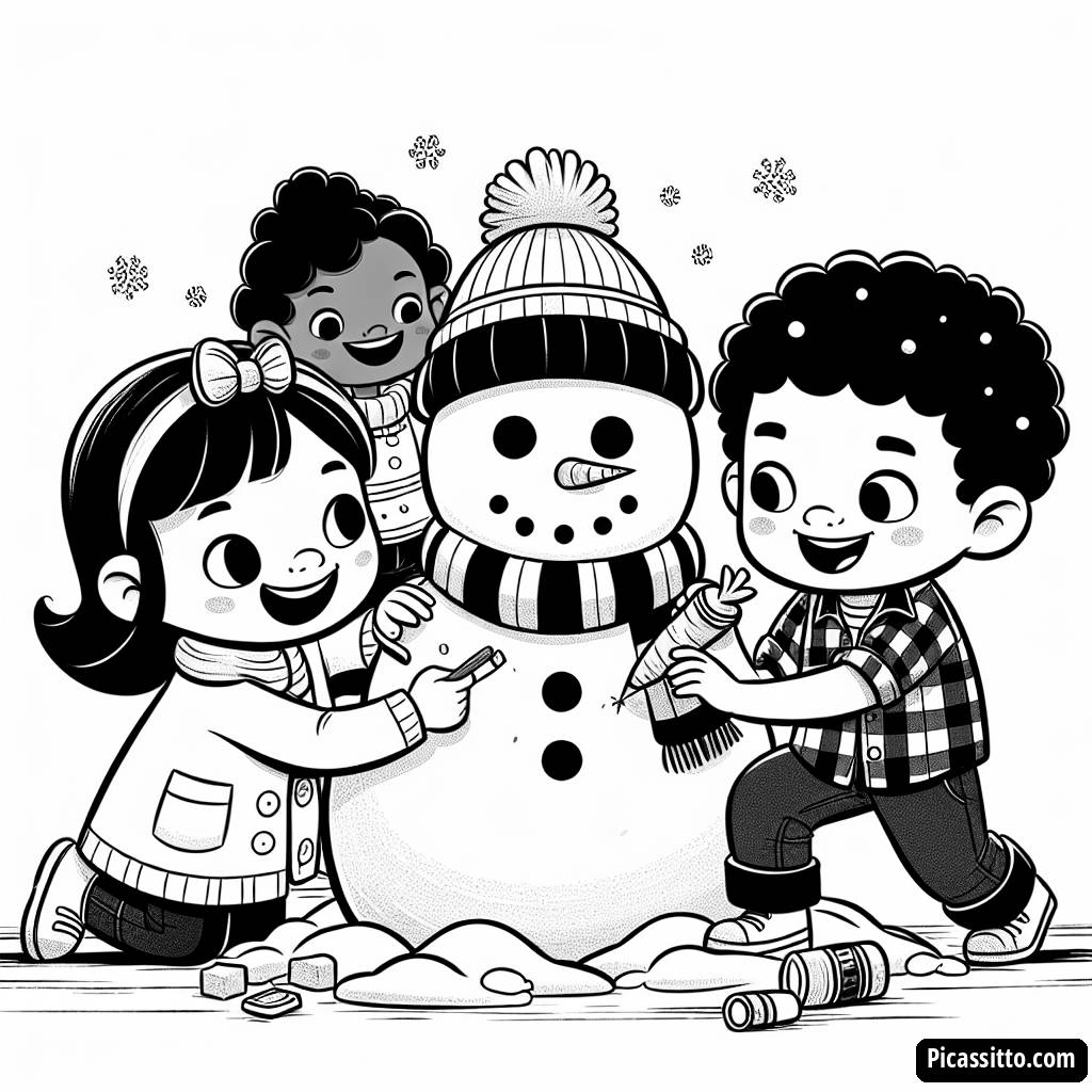Get ready for winter fun with this free, printable coloring page of children building a snowman with a carrot nose and button eyes!