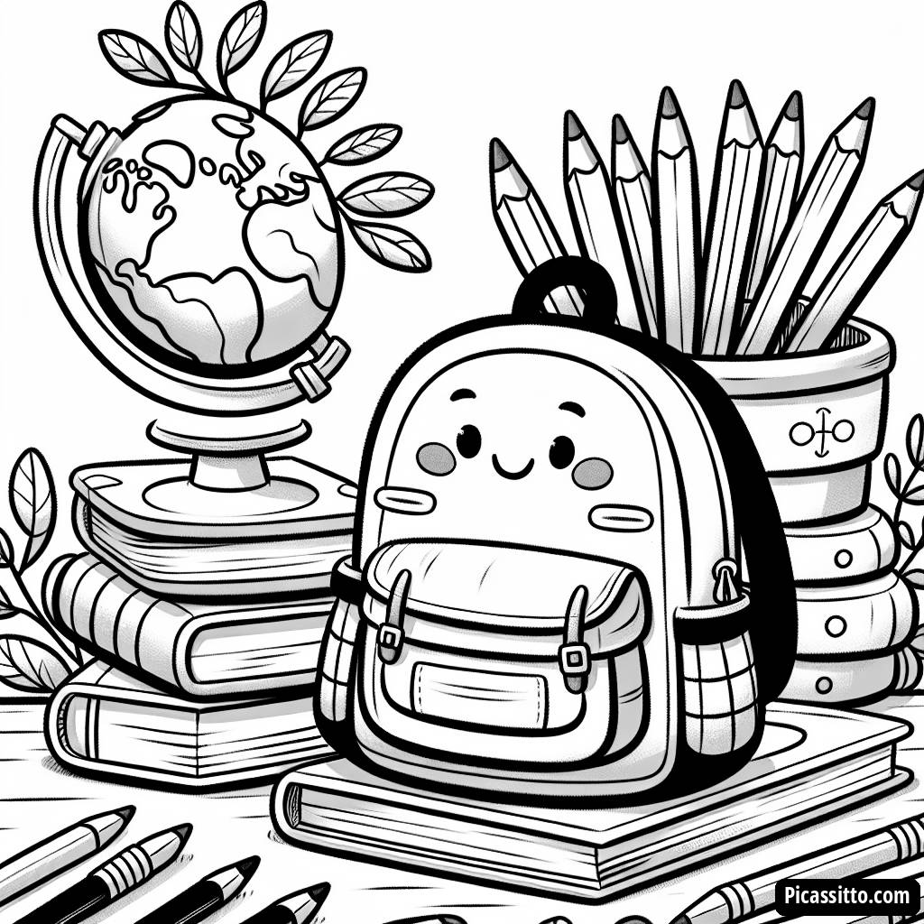 Download this free and printable Happy Backpack coloring page, perfect for school-themed fun with colorful pencils, books, and a globe!