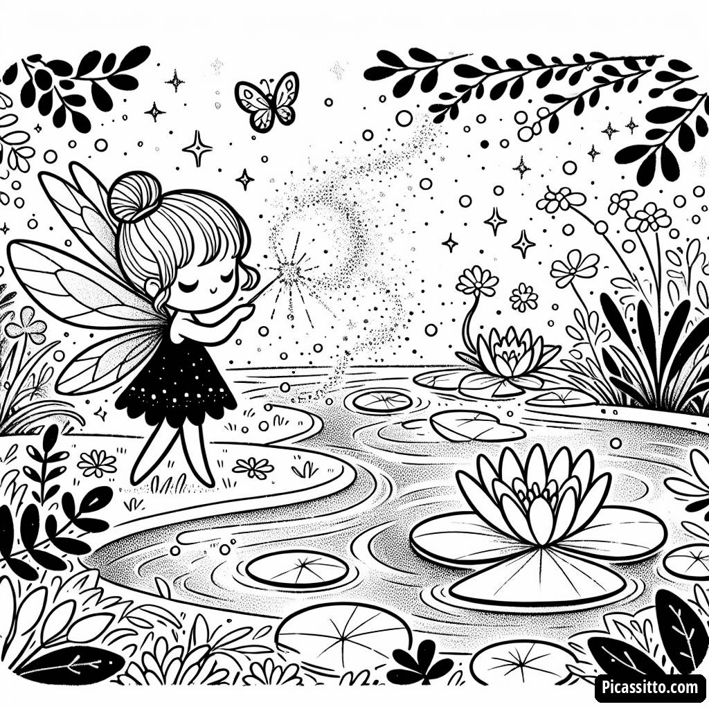 Dive into a world of enchantment with this free and printable fairy coloring page featuring a fairy sprinkling glitter over a sparkling pond with lily pads!