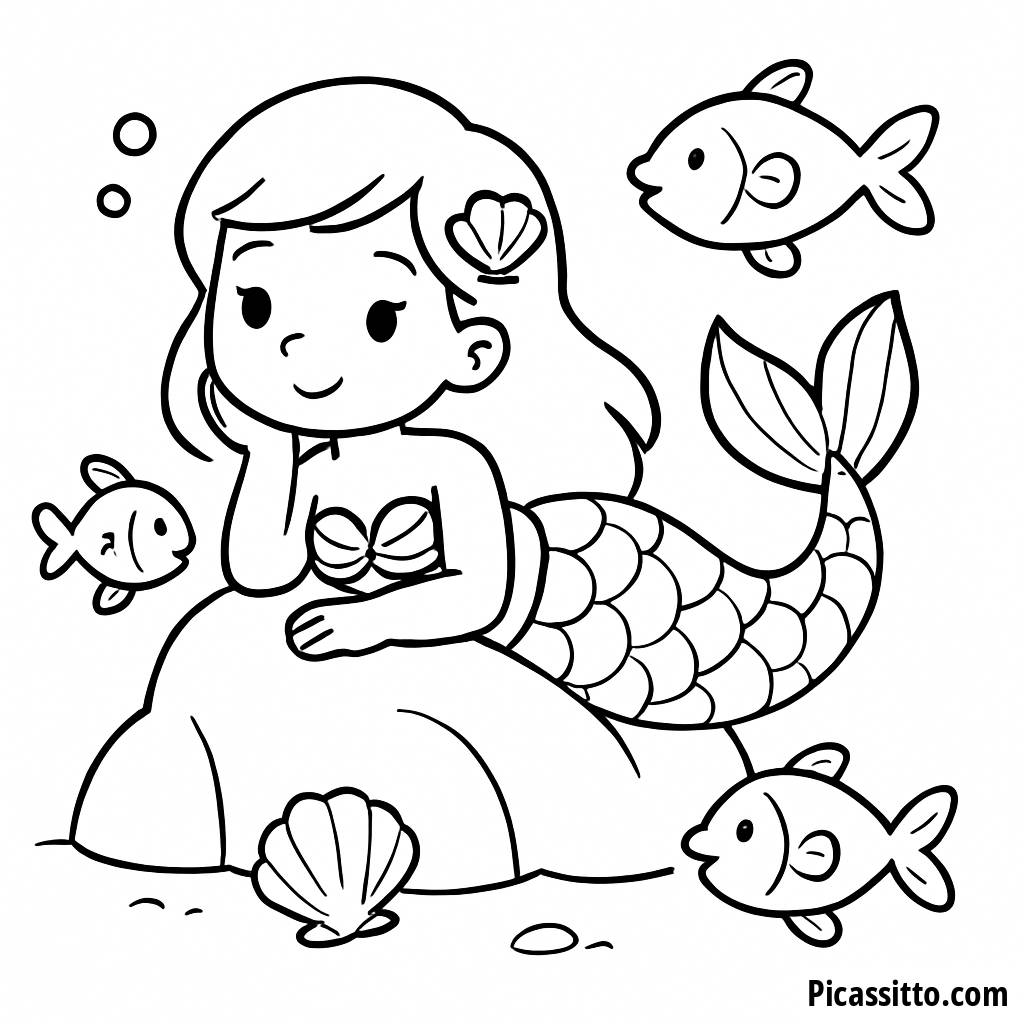 Enjoy this free and printable mermaid coloring page featuring a beautiful mermaid lounging on a rock with playful fish and seashells. Perfect for inspiring creativity in kids!