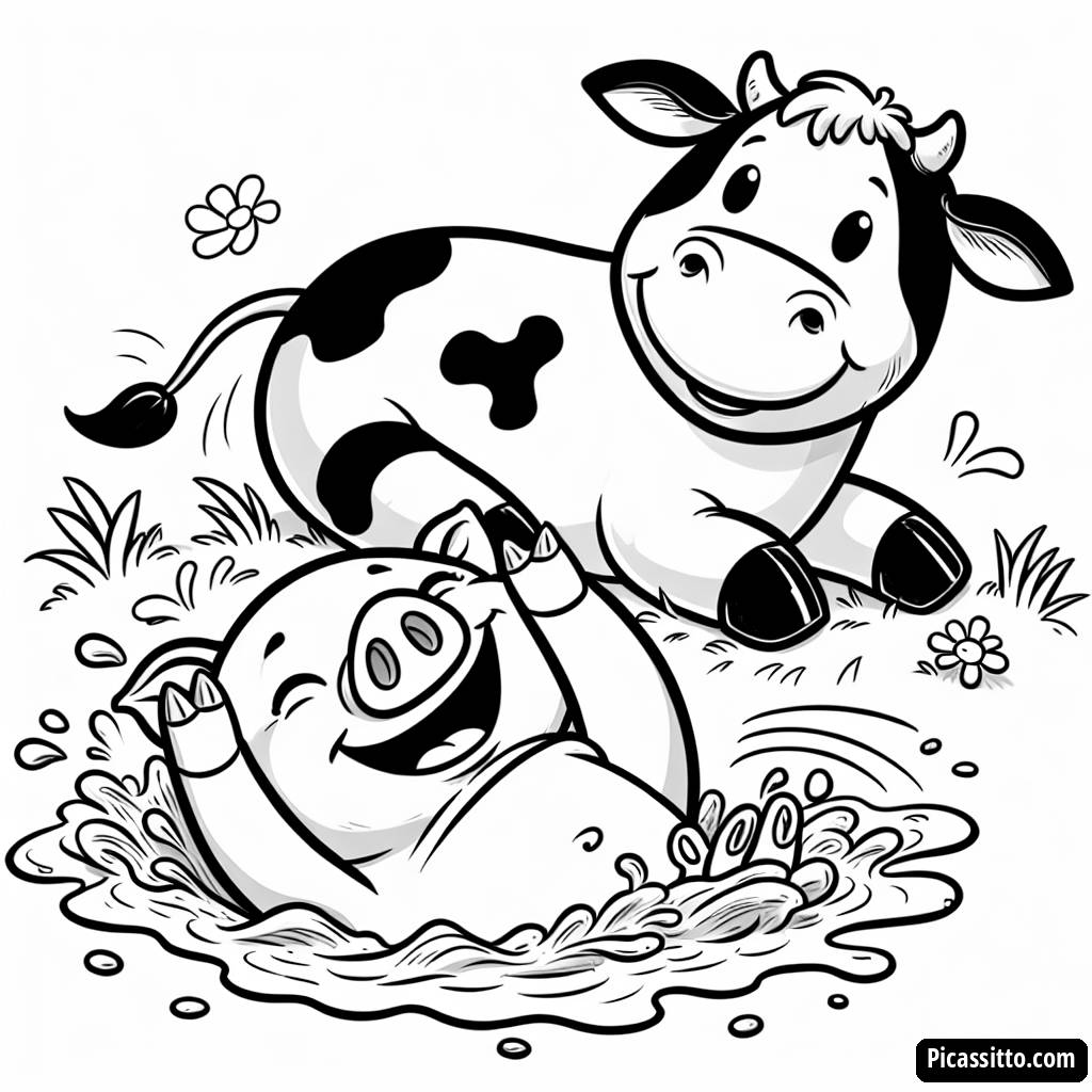 Enjoy this free and printable coloring page featuring a playful pig rolling in the mud next to a cheerful cow grazing in the field. Perfect for farm animal lovers!