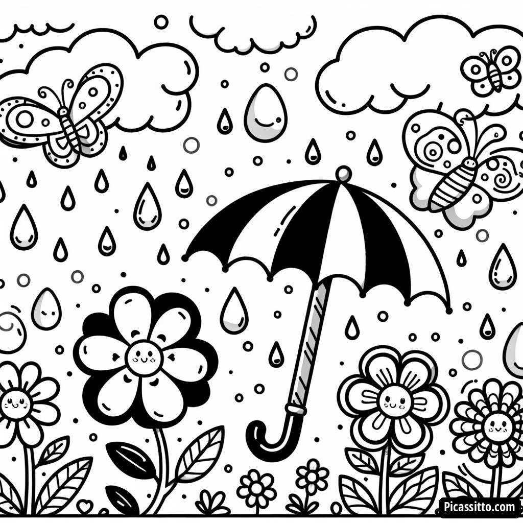 Enjoy this free and printable coloring page featuring raindrops falling on beautiful flowers, complete with a small umbrella and playful butterflies! Perfect for kids who love nature.