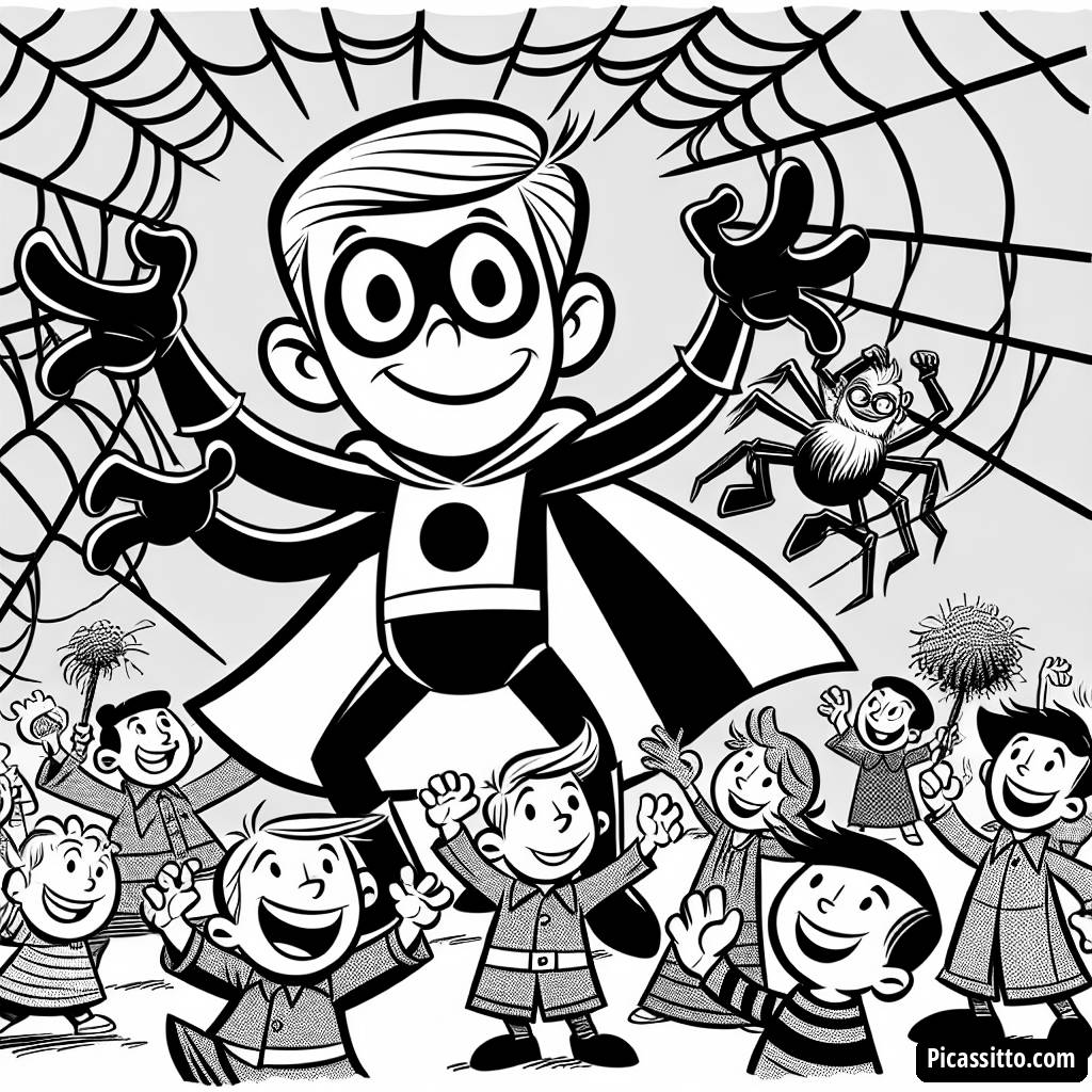 Enjoy this free and printable Spider-Man coloring page where our hero catches a villain with his webs while kids cheer in excitement!