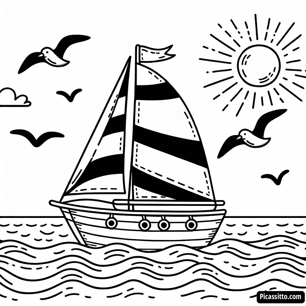 Enjoy this free and printable coloring page of a colorful sailboat gliding across a sunny ocean with seagulls overhead!