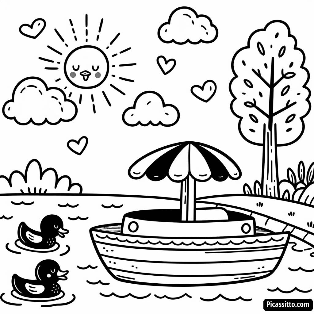 Enjoy this free and printable coloring page featuring a whimsical paddleboat floating on a sunny lake with friendly ducks nearby!