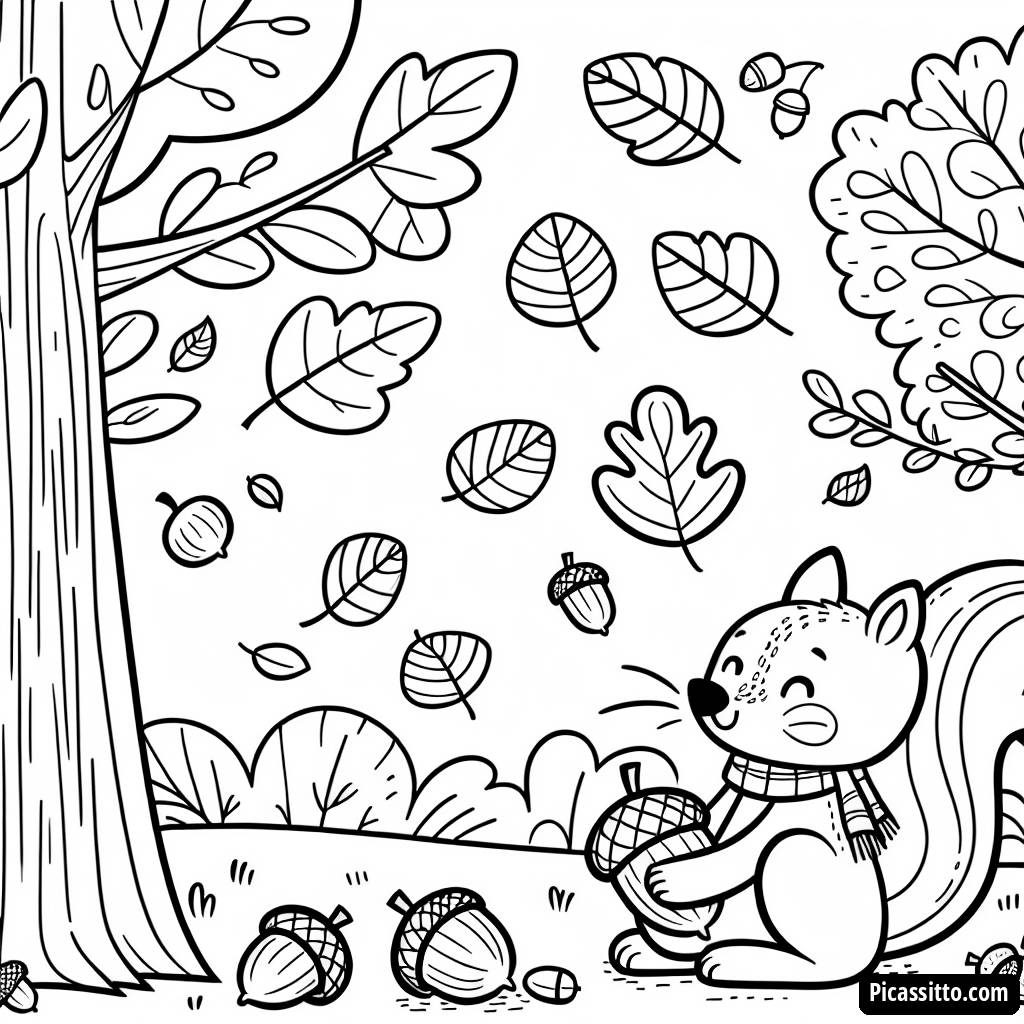 Disfruta de esta página para colorear de hojas de otoño, ¡con un juguetón esquilo recogiendo bellotas! ¡Es gratuita y imprimible, perfecta para que los niños exploren la belleza de la temporada!