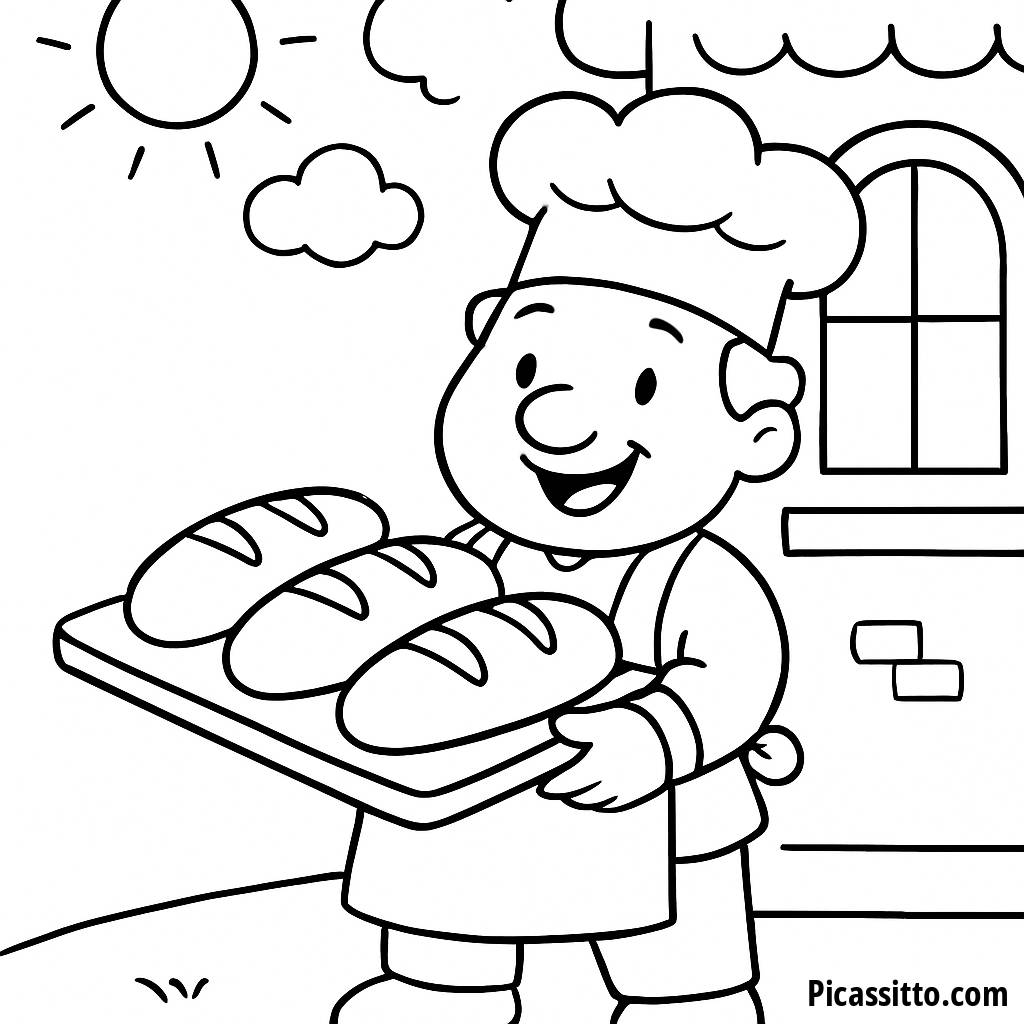 Descarga esta página para colorear gratuita y imprimible que presenta a un alegre panadero sosteniendo una bandeja de pan recién horneado. ¡Ideal para los pequeños artistas que aman la repostería!