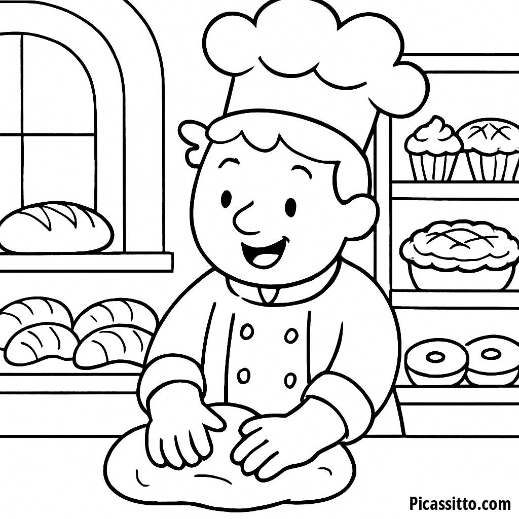 Descarga esta divertida página para colorear del alegre panadero, perfecta para pequeños artistas que aman la repostería y los pasteles.