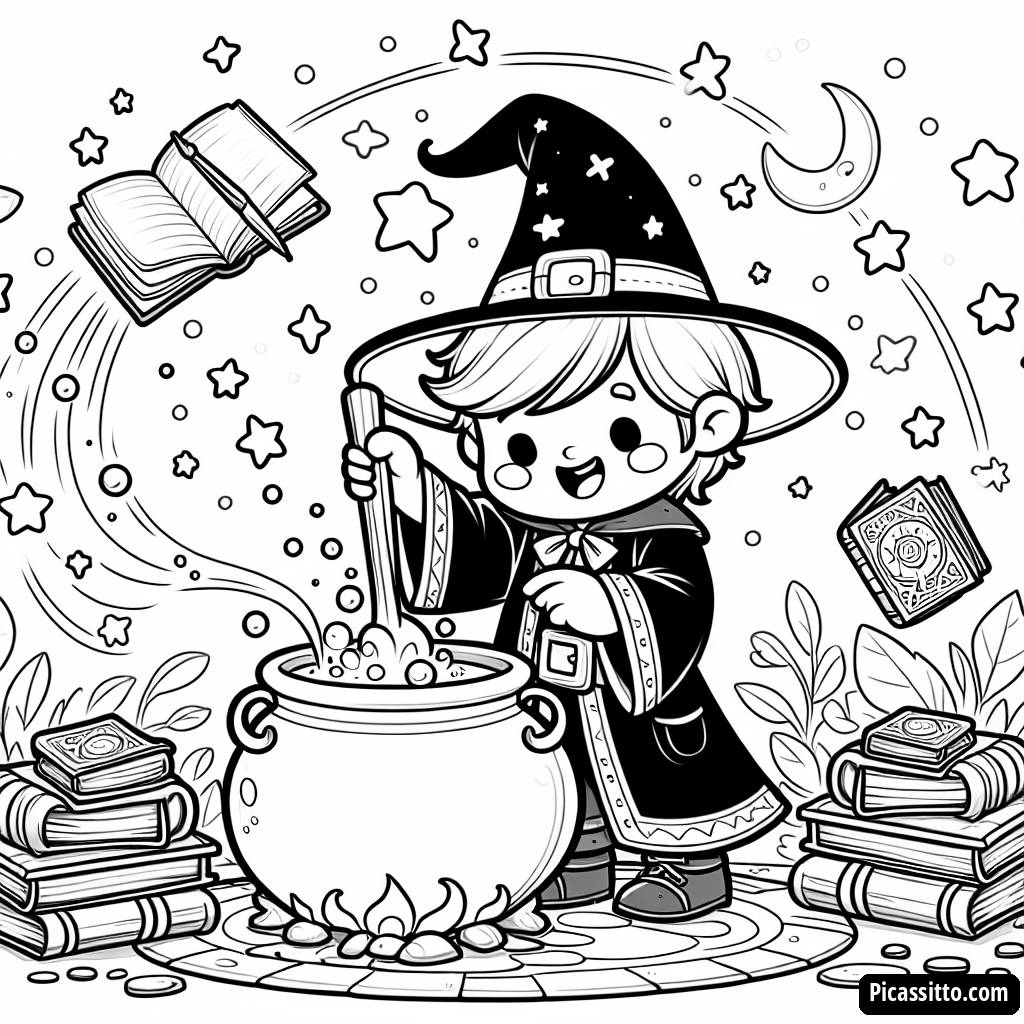 Dale vida a la magia con esta página para colorear gratuita de un mago alegre, que presenta un caldero burbujeante y libros mágicos flotantes. ¡Perfecta para pequeños artistas que aman la aventura!