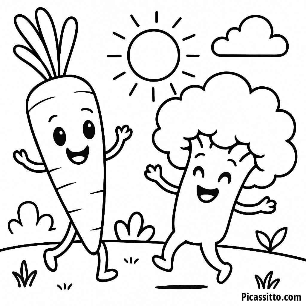 Disfruta de esta página para colorear gratuita y imprimible con una zanahoria sonriente y brócoli bailando en un jardín soleado. ¡Perfecta para pequeños artistas que aman las verduras!