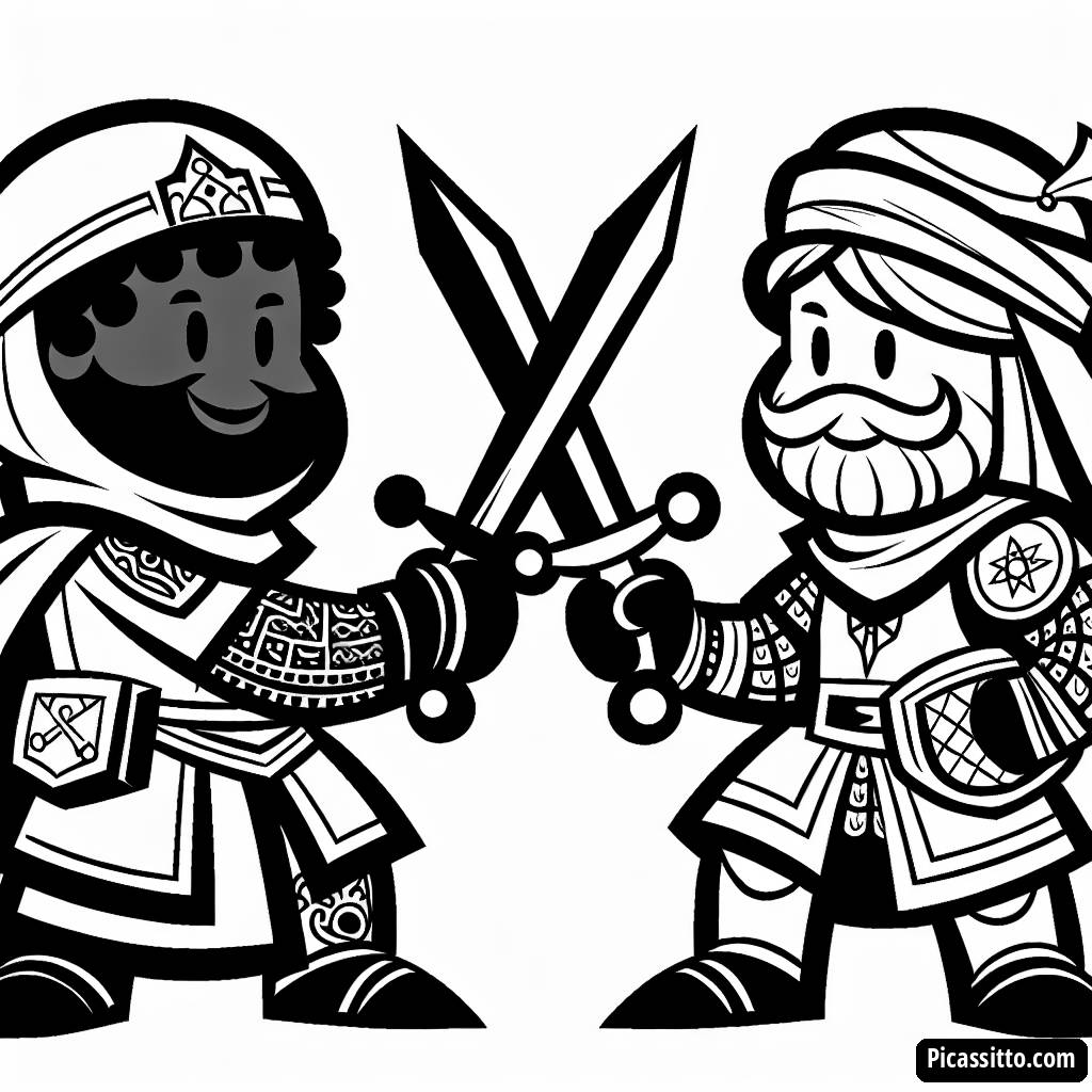 Descarga esta página para colorear gratuita y imprimible con dos caballeros en armadura practicando esgrima. ¡Perfecta para el juego imaginativo!