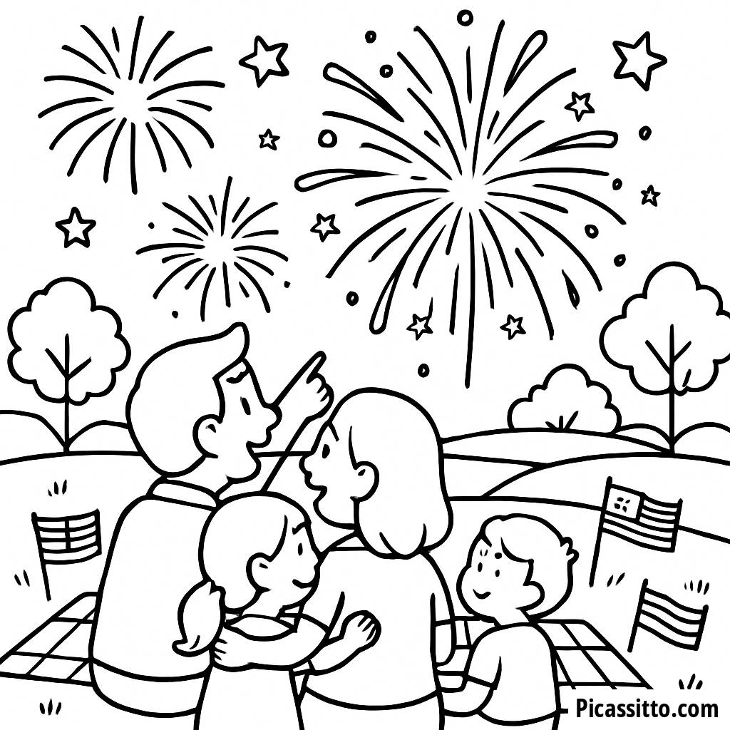 Disfruta de esta página para colorear de fuegos artificiales en familia, ¡perfecta para celebrar el Día de la Independencia con una colorida escena de picnic!