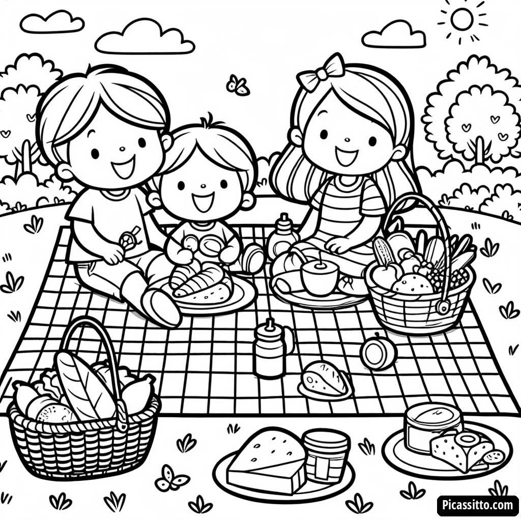 Disfruta de una encantadora escena de picnic familiar en esta página para colorear gratuita y imprimible. ¡Reúne tus colores favoritos y da vida a este alegre momento al aire libre!