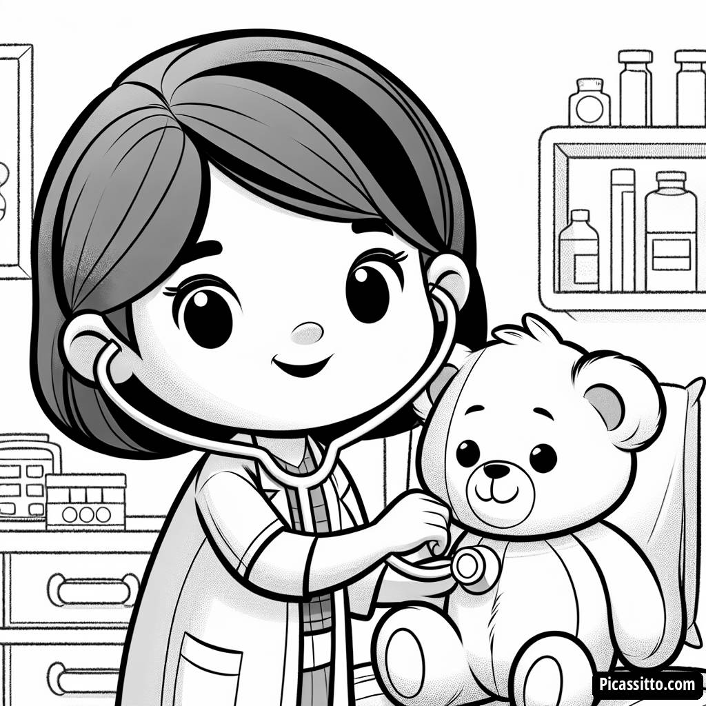 Descarga esta página para colorear gratuita y imprimible de un doctor amigable examinando un oso de peluche en una clínica colorida. ¡Perfecta para niños que aman jugar con la imaginación!