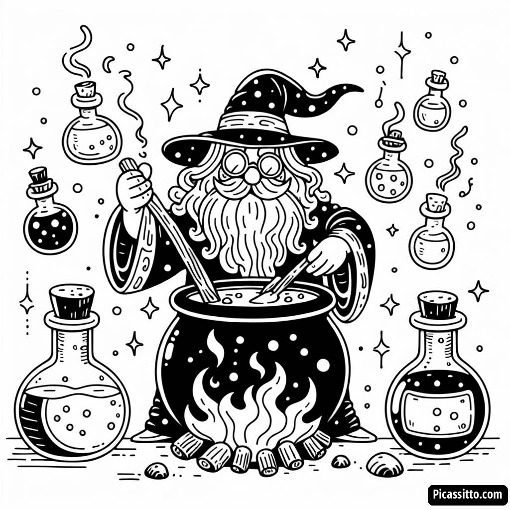 ¡Descarga esta página para colorear gratis e imprimible de un mago amigable que revuelve un caldero burbujeante lleno de pociones coloridas!