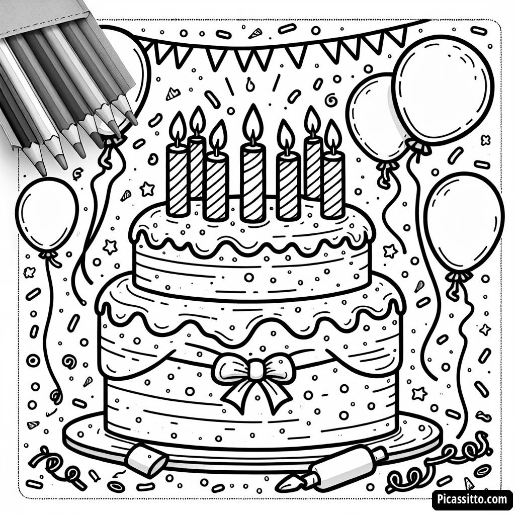 Celebra la alegría de los cumpleaños con esta página para colorear de un gran pastel de cumpleaños, ¡completa con velas, globos y confeti, y es gratis para imprimir!