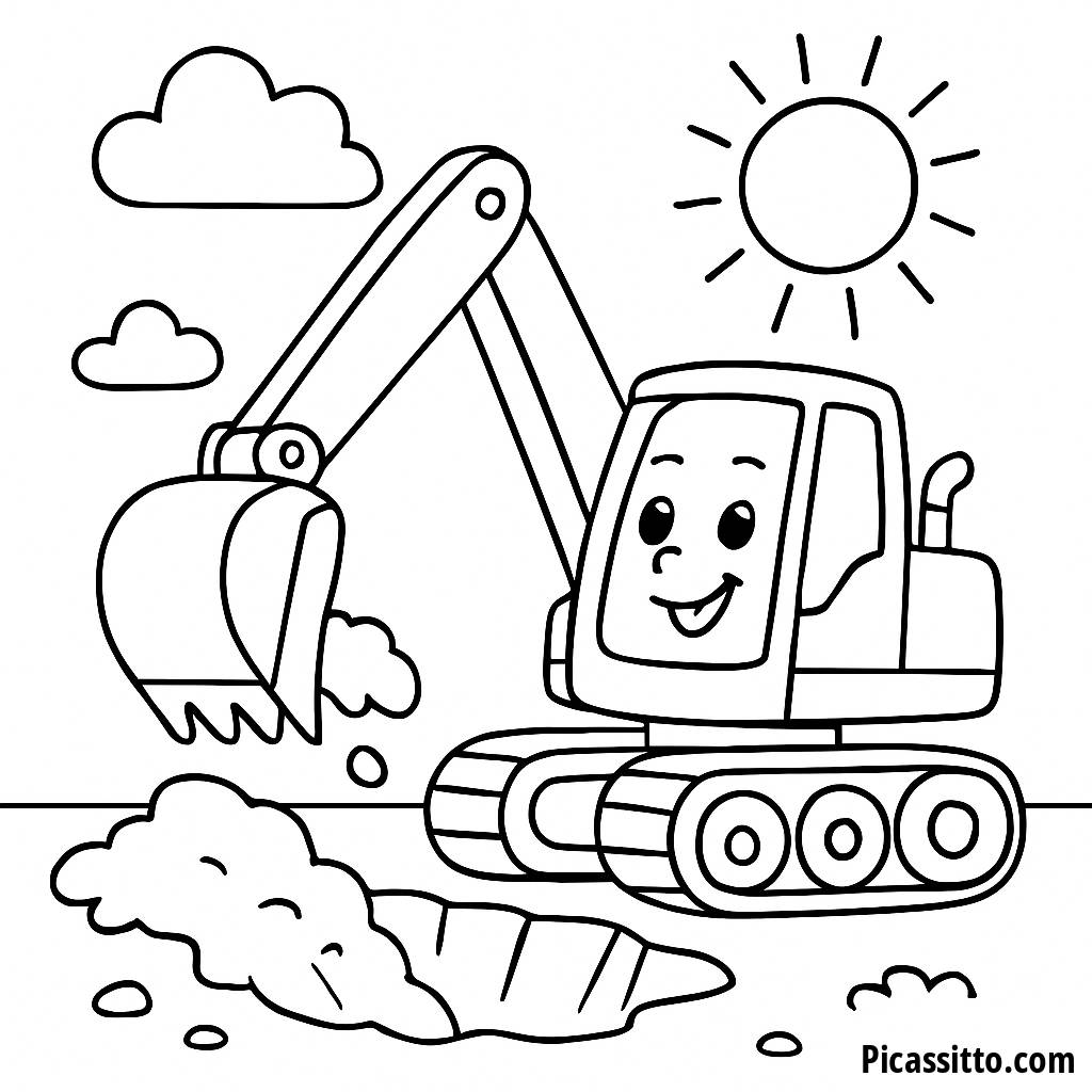 Descarga esta página para colorear de excavadora feliz, ¡gratis y imprimible, perfecta para pequeños constructores! Observa cómo brilla la creatividad de tu hijo mientras colorea la excavadora sonriente y el sol brillante.