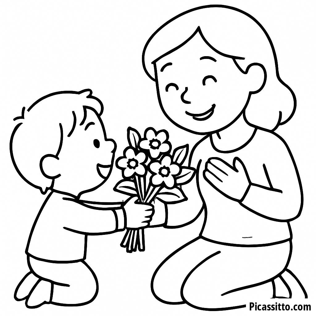 Celebra el Día de la Madre con esta adorable página para colorear gratuita de un niño entregando un ramo de flores a su madre sonriente.